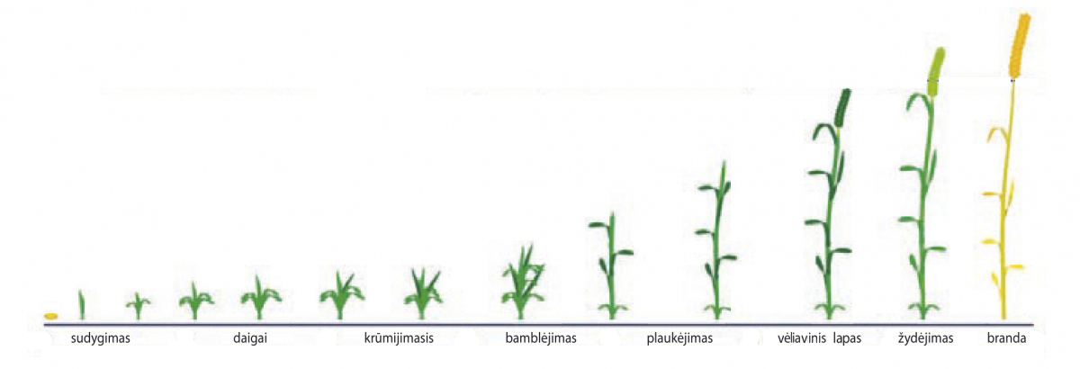 Kvietrugiai | 50 | 1. Krūmijimosi tarpsnis, bamblėjimo pradžia 2. Vėliavinio lapo pasirodymo metu |