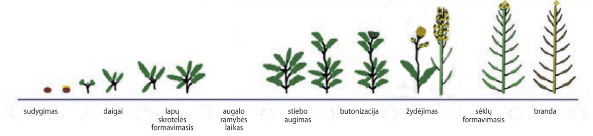 1. Nuo skroteles iki stiebo formavimosi tarpsnio 2. Butonizacijos pradžia |